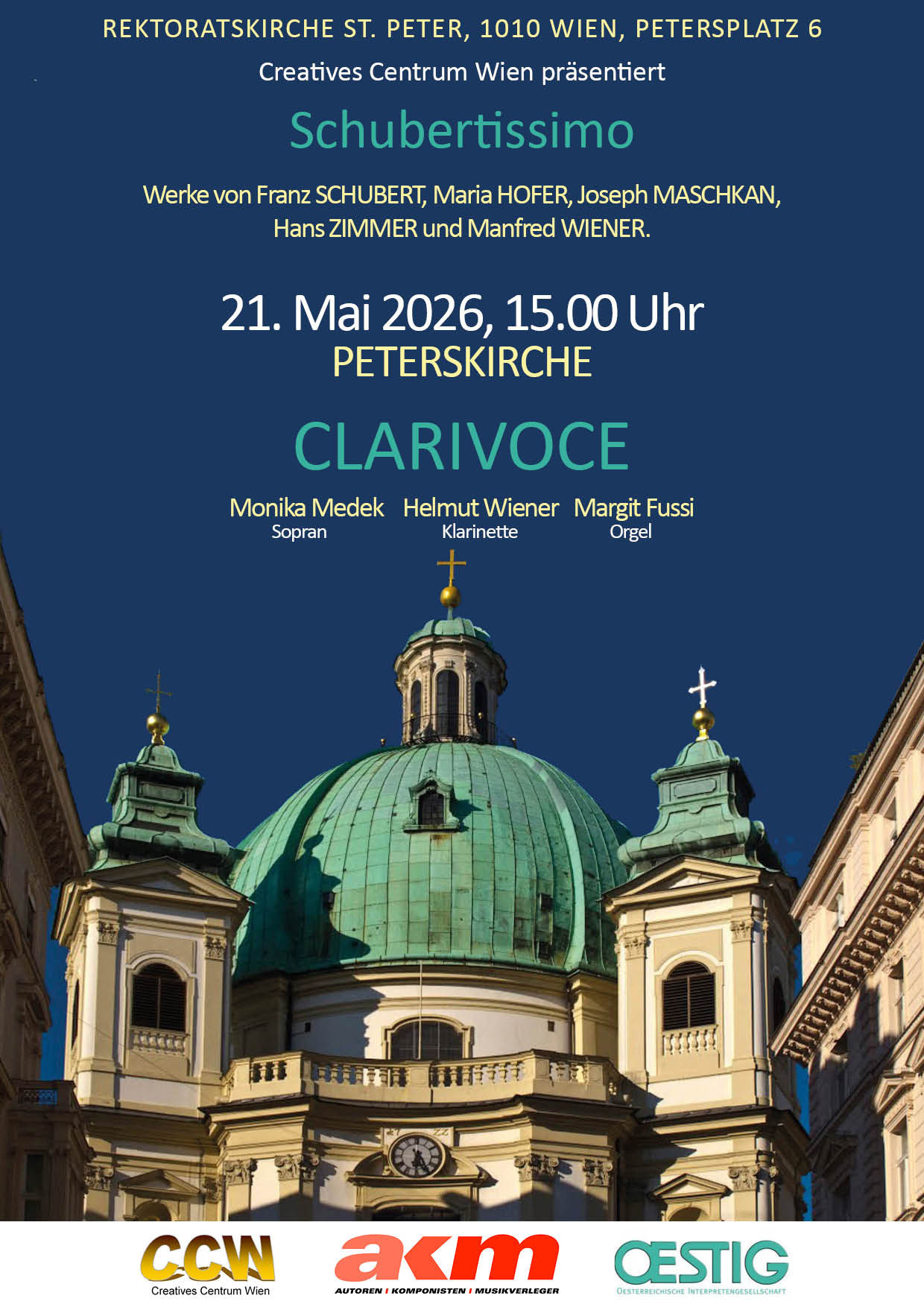 Dass Werke für Orchester, traditionell dicht orchestriert, auch in kleiner Besetzung stimmungsvoll aufführbar sind, beweisen die international tätige lyrisch-dramatische Sopranistin Monika Medek, der Soloklarinettist der Tonkünstler Helmut Wiener und alternierend die beiden Konzertpianistinnen Stephanie Timoschek und Margit Fussi gemeinsam als CLARIVOCE.