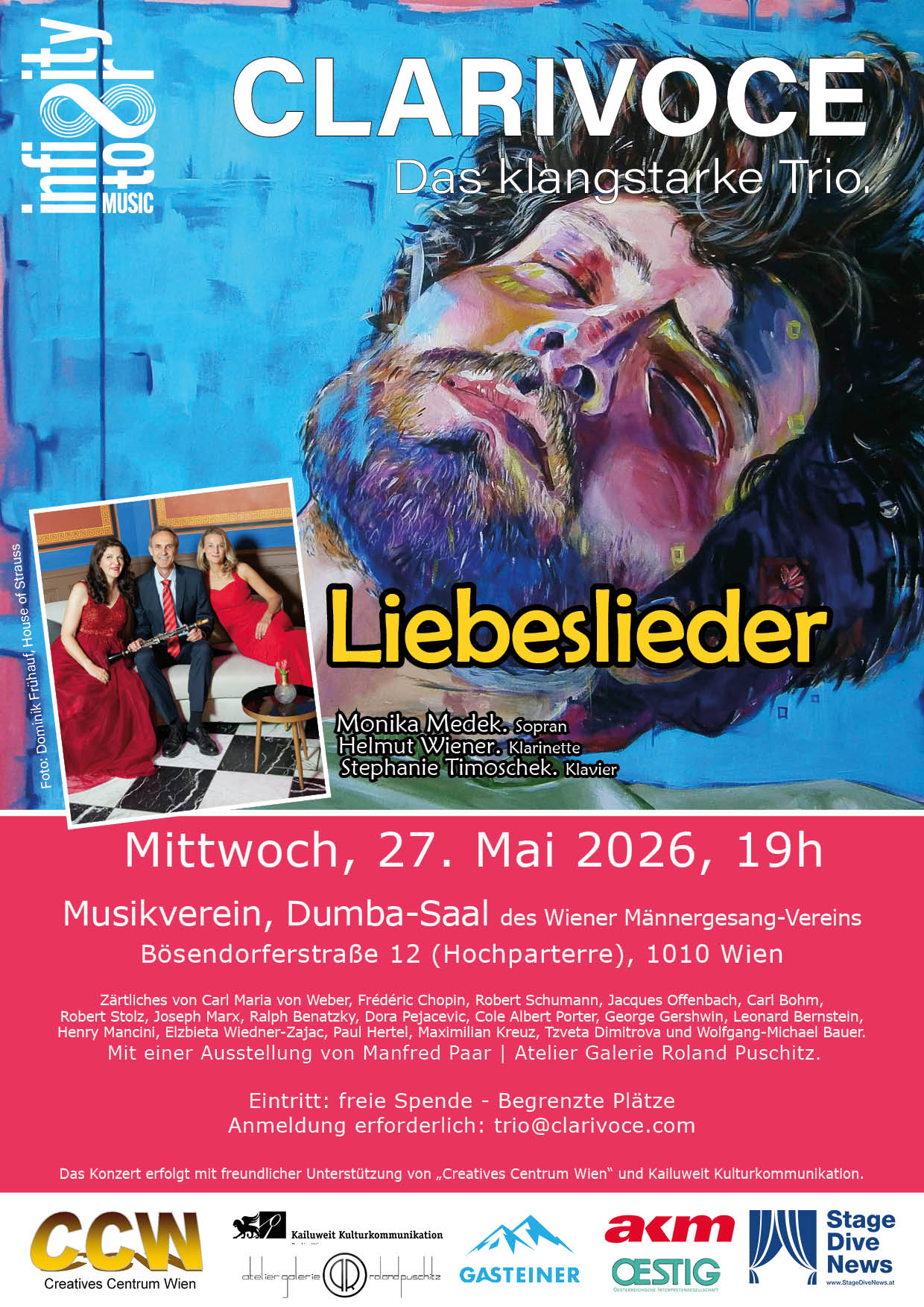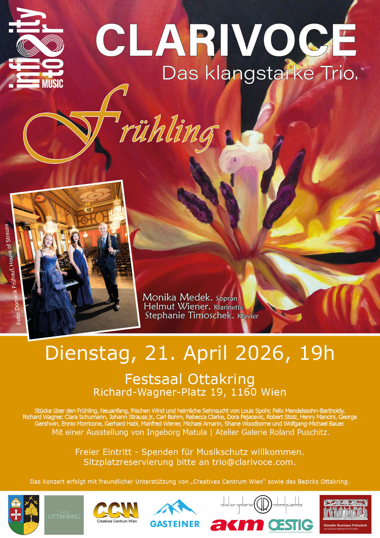 The internationally active lyric-dramatic soprano Monika Medek, the solo clarinettist of the Tonkünstler Helmut Wiener and the two concert pianists Stephanie Timoschek and Margit Fussi alternating, together as CLARIVOCE, prove that works for orchestra, traditionally densely orchestrated, can also be performed atmospherically in a small ensemble.