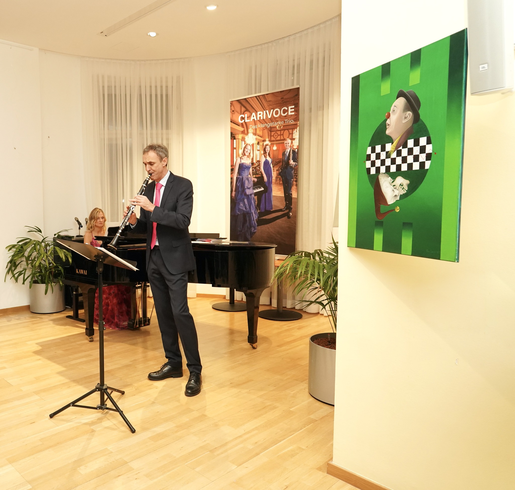 In der Pause begeisterte eine Ausstellung von Jan Fizer, kuratiert von der Atelier Galerie Roland Puschitz das Publikum.